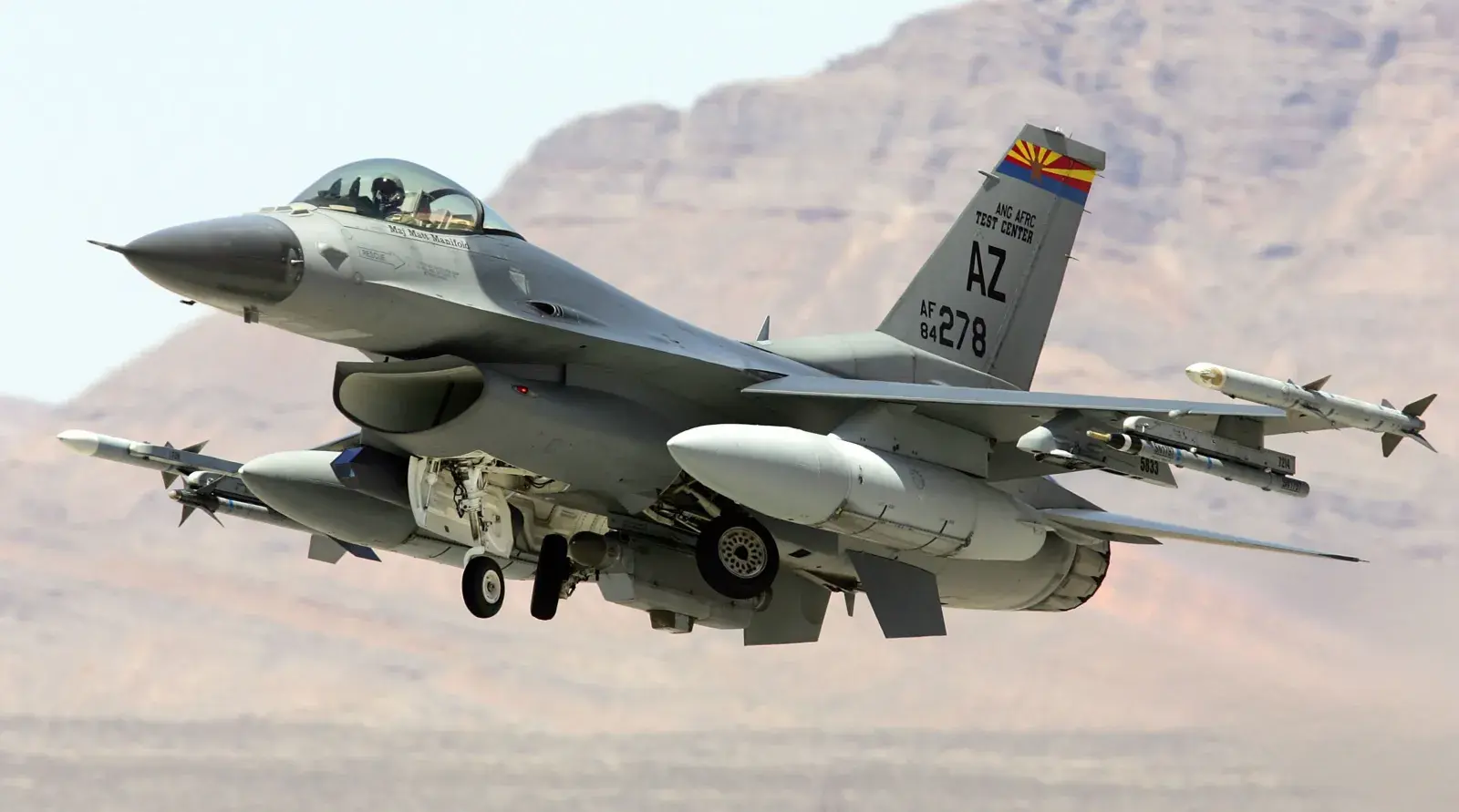 This illustrative image from 2006 shows an Arizona Air National Guard F-16C Fighting Falcon in Las Vegas, Nevada. (Photo by Ethan Miller/Getty Images)