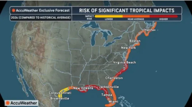 Meanwhile, South Florida and the entire eastern coast face a near-average risk for significant tropical impacts this year, the AccuWeather map revealed.