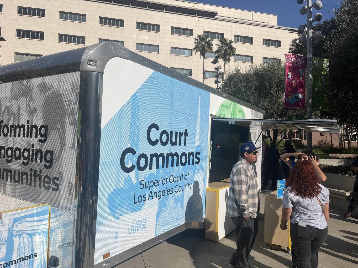 Sergio Tapia, presiding judge of the L.A. County courts, announced the mobile trailer called “Court Commons” at a ribbon-cutting event across from the Stanley Mosk Courthouse.