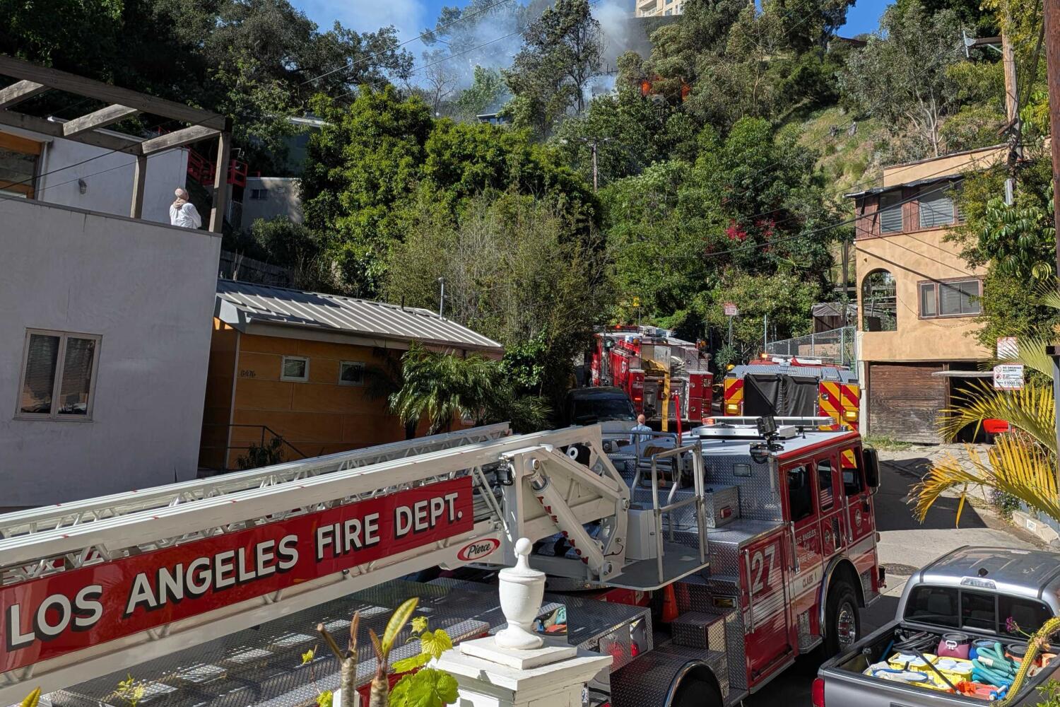 The first firefighters arrived by 9:45 a.m. as neighbors watched flames rise 10 to 15 feet above the roofline, surrounded by trees bending in the wind. Though the house’s location on a steep slope at the end of a cul-de-sac posed a challenge, the L.A. Fire Department incident report said firefighters were able to knock down the fire in 73 minutes.