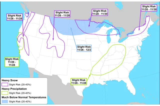 According to an outlook from the Climate Prediction Center (CPC) for the November 26 to December 2 period, there is a “slight” 20 to 40 percent chance of heavy snow across parts of Washington, Oregon, California, Idaho, Montana, Wyoming, Colorado, and Utah from November 26 to 28.