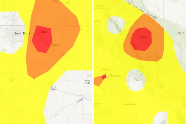 Another pocket of unhealthy air is present in Arizona, covering an area around Payson, as well as a portion of Phoenix.